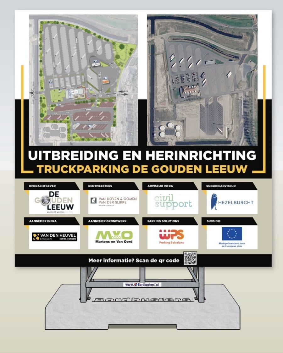 The feasibility study and the preparatory studies for the development of a safe and secure truck parking (SSTPA) with 267 parking spaces for trucks and associated facilities for truckdrivers at De Gouden Leeuw have been completed. The final design is now ready and the permit procedure is finished. The Environmental permit and the water board permit have both been granted. Construction started in the summer of 2025. The realisation of this project is partly made possible by European subsidies.